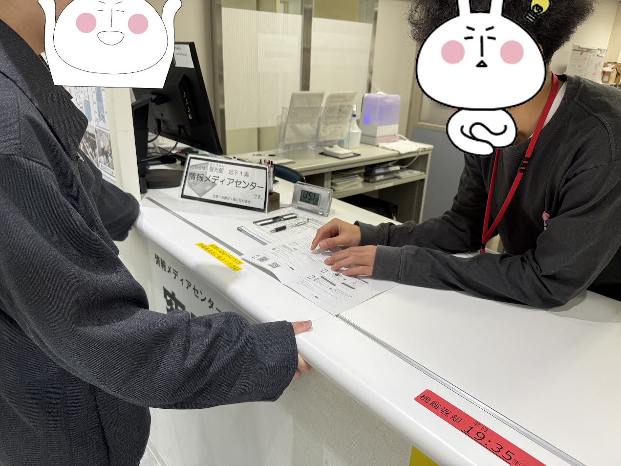 勤務開始10分前に情報メディアセンターへ出勤します。前の勤務者から引き継ぎを受けます。