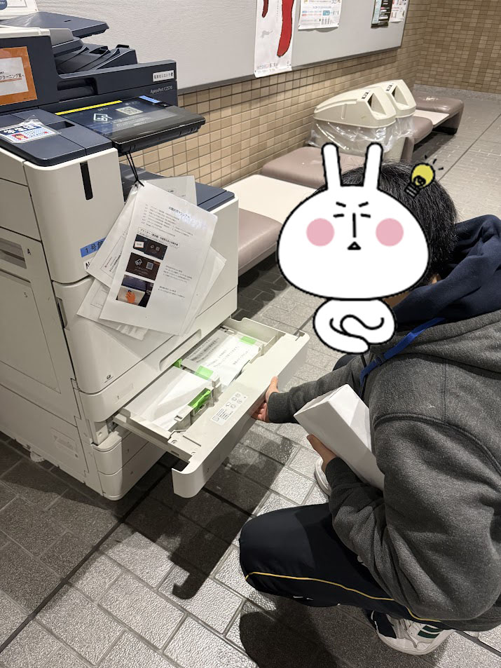 瀬田キャンパスのプリントスポットに設置されている複合機の用紙補充を行っています。また、紙詰まりなど複合機のトラブル対応も行っています。