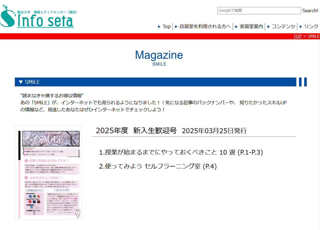 「SMiLE」という情報冊子を編集、発行しており、主に情報メディアセンターからのお知らせや、PCやITに関する情報を発信しています。